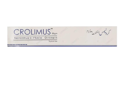 Crolimus Ointment 0.1% 30 g is a topical dermatological medication formulated with tacrolimus, an immunomodulating active ingredient used to treat inflammatory skin conditions — especially moderate to severe atopic dermatitis (eczema)...